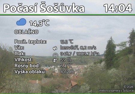 Čas měření: 12:00:00 Teplota: 15.2 ˚C Vlhkost vzduchu: 48 % Rychlost větru: 2.6 m/s Směr větru: 225 ° Oblačnost: 0 [škála 0-8] Výška sněhu: cm Teploty pod povrchem: